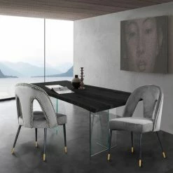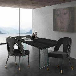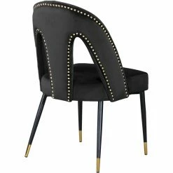 Introduce an element of glamour into your dining room with the Meridian Furniture Inc Akoya Upholstered Dining Side Chair with Nailhead Trim – Set of 2. These two dining chairs are upholstered in velvet and offered in your choice of available color. Keyhole backs are detailed by gold nail head trim.