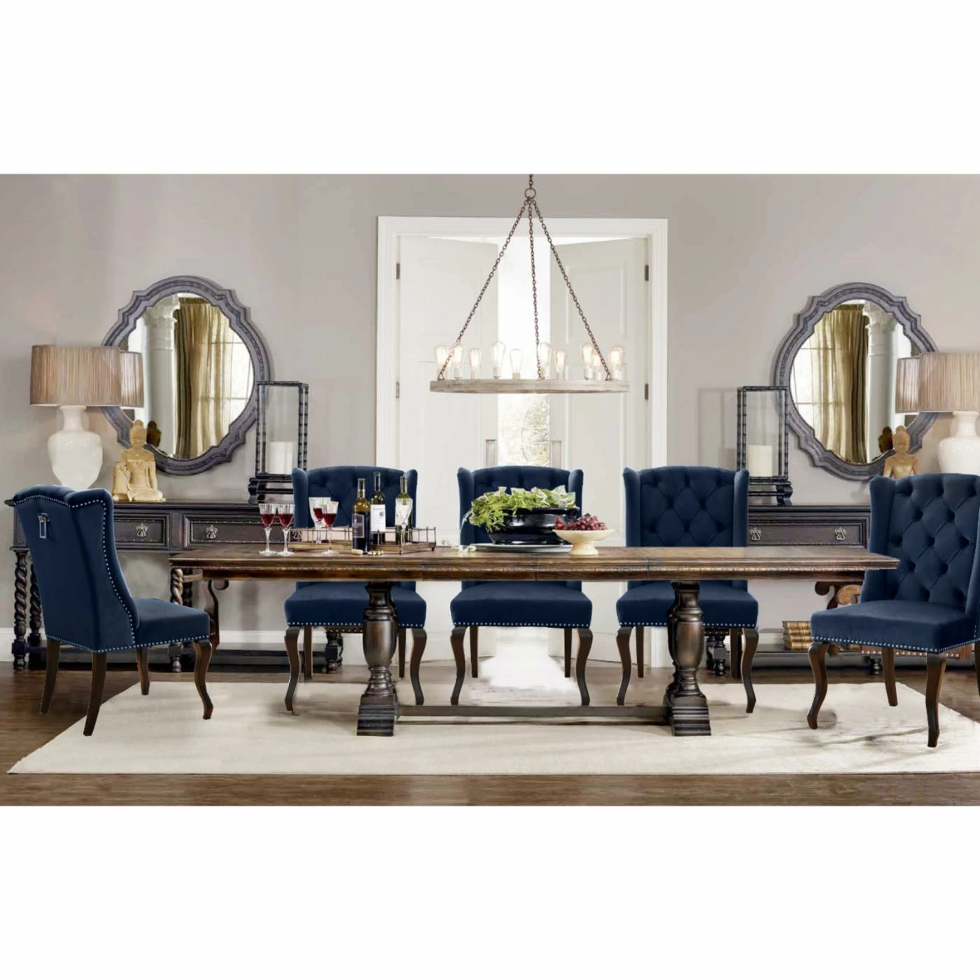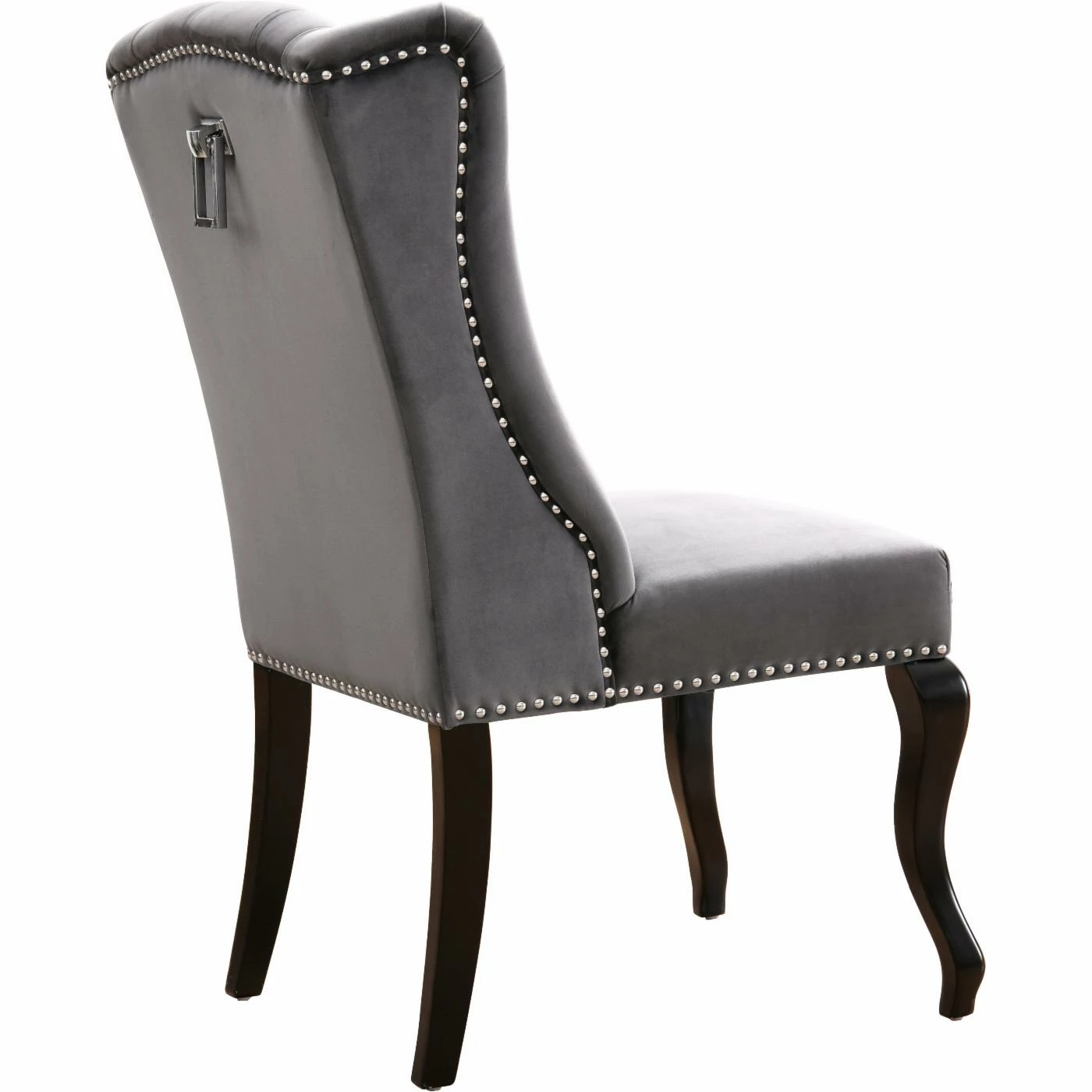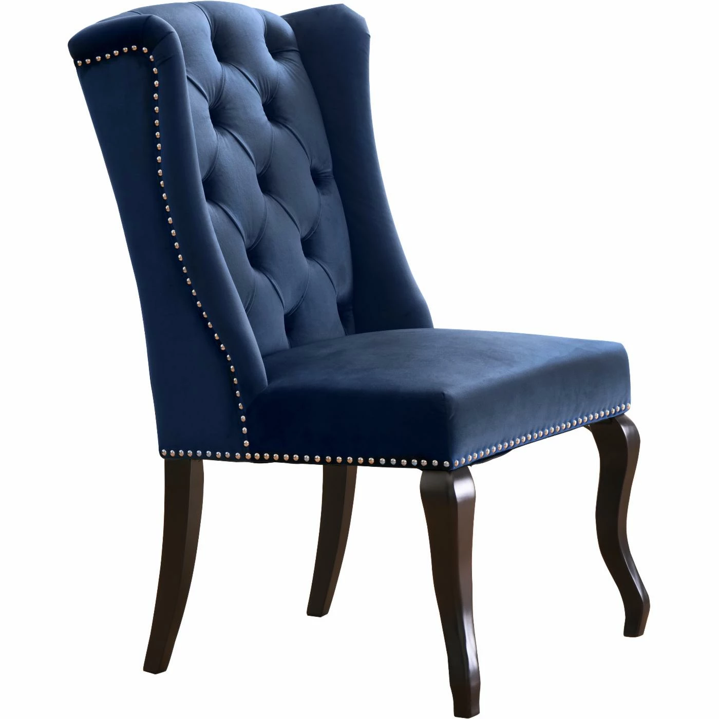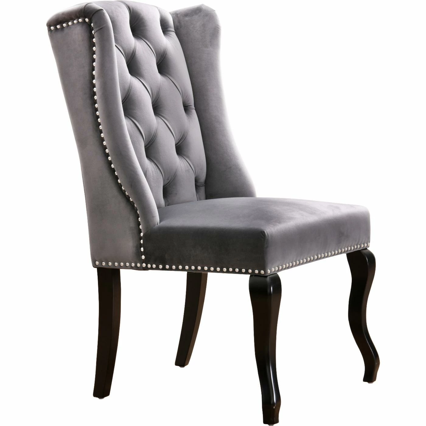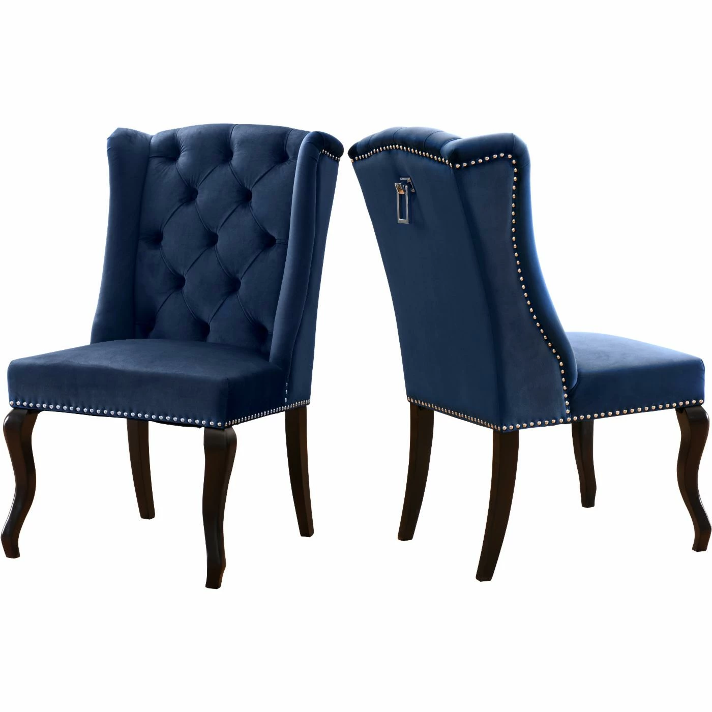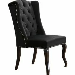 For a glam twist on tradition, the Meridian Furniture Inc Suri Tufted Dining Side Chair with Nailhead Trim – Set of 2 is accented by polished nail head trim and distinctive jewelry at the back. These two dining chairs are graced with deeply button tufted wingbacks and generous seats that are covered in your choice of available velvet upholstery color. Cabriole legs enhance the elegance.
