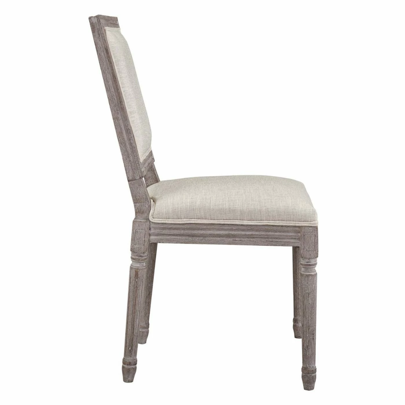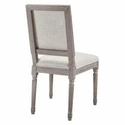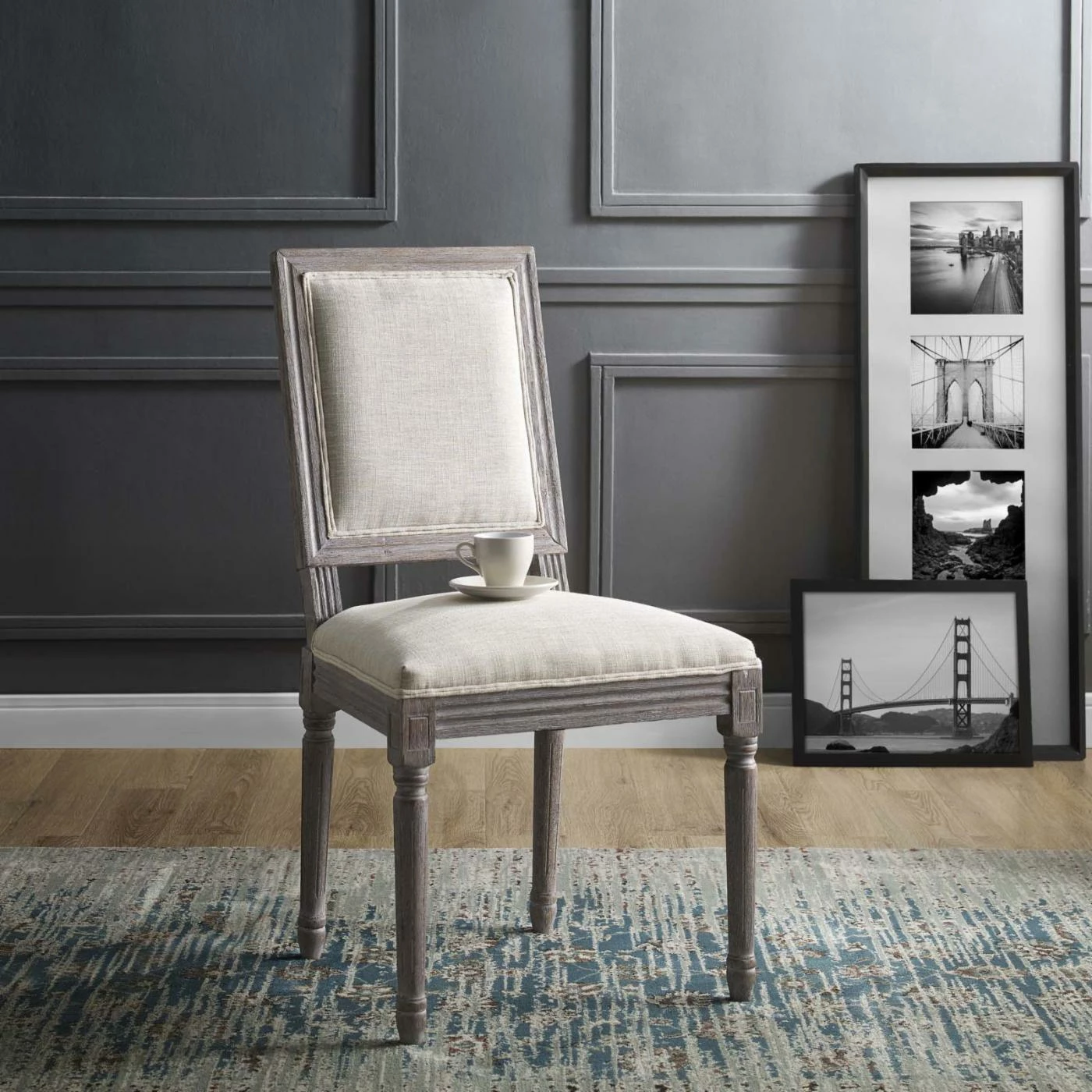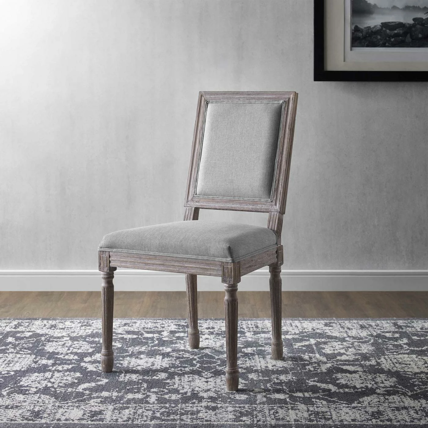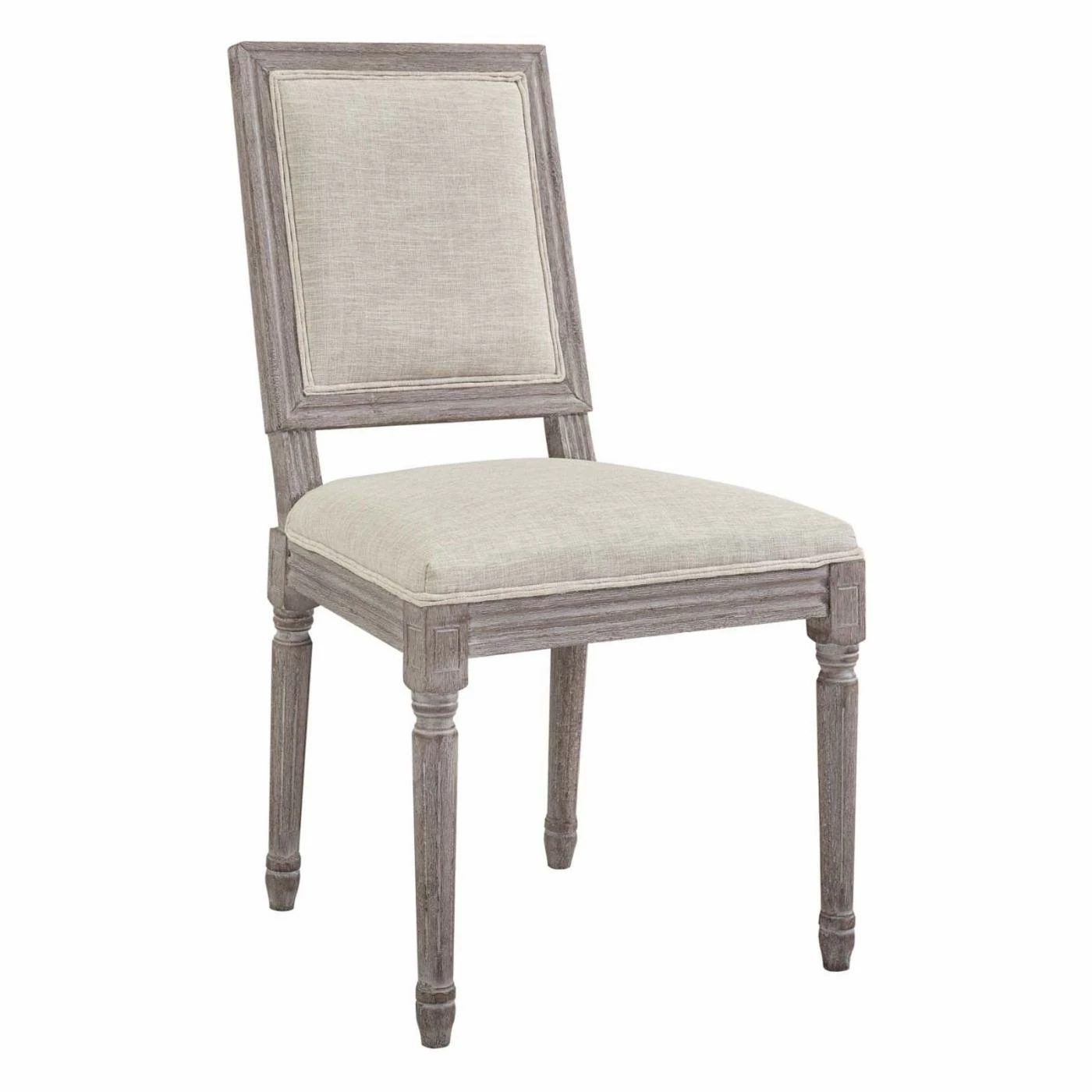 Bring country French charm to your dining area with the Modway Court Vintage French Upholstered Fabric Dining Side Chair. Its fluted rubberwood frame features a weathered finish to create a vintage look youβll love. The polyester upholstery is welted to add a touch of elegance and comes in your choice of available colors. Dense foam padding makes every meal a comfortable experience while the foot pads ensure you wonβt snag or scratch your floor every time you leave the table.