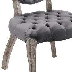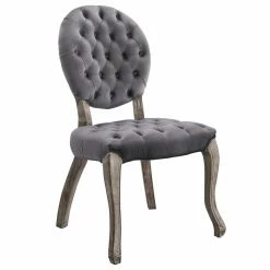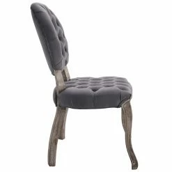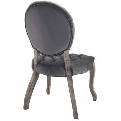 The Modway Exhibit Velvet Tufted Dining Side Chair offers a French vintage Louis XVI style chair with all the bells and whistles. The oval-shaped back and seat showcase deep button tufting and a plump foam-padded cushion for ultimate comfort and style. The elegant design is enhanced even more by the rubberwood cabriole legs that are weathered for a vintage look. The velvet polyester upholstery is conveniently stain resistant and comes in your choice of available color to match your color scheme.