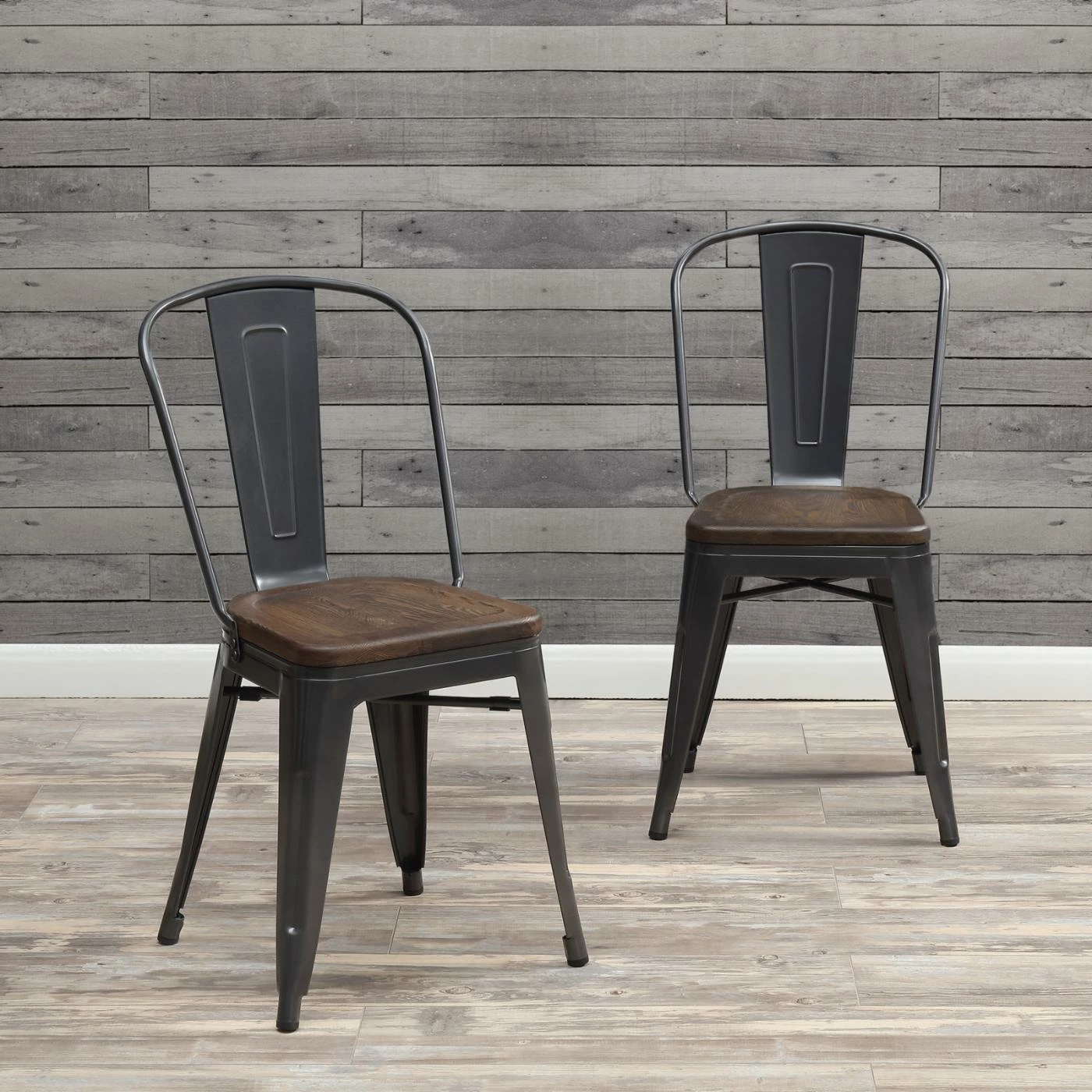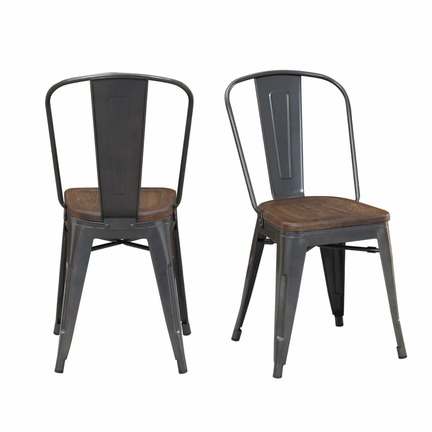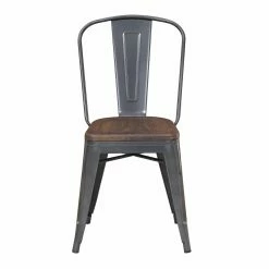 The Picket House Furnishings Davis Industrial Dining Chair – Set of 2 is made with sturdy metal frames. The chairs boast a splat-back design and have sleek, angled legs. Their wood seats are contoured to offer a more comfortable experience, and the prominent grain detail brings added character to the look. Plus, this set’s gray and walnut palette proves to be extremely versatile.