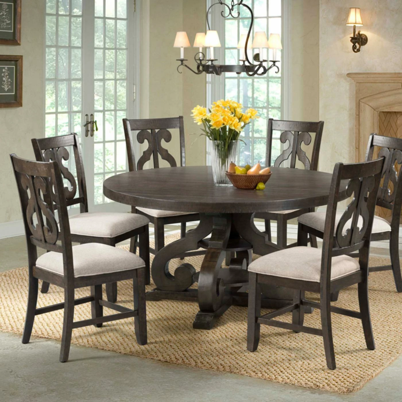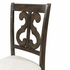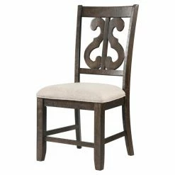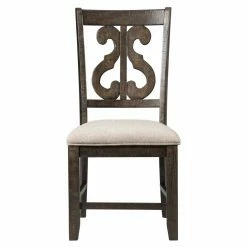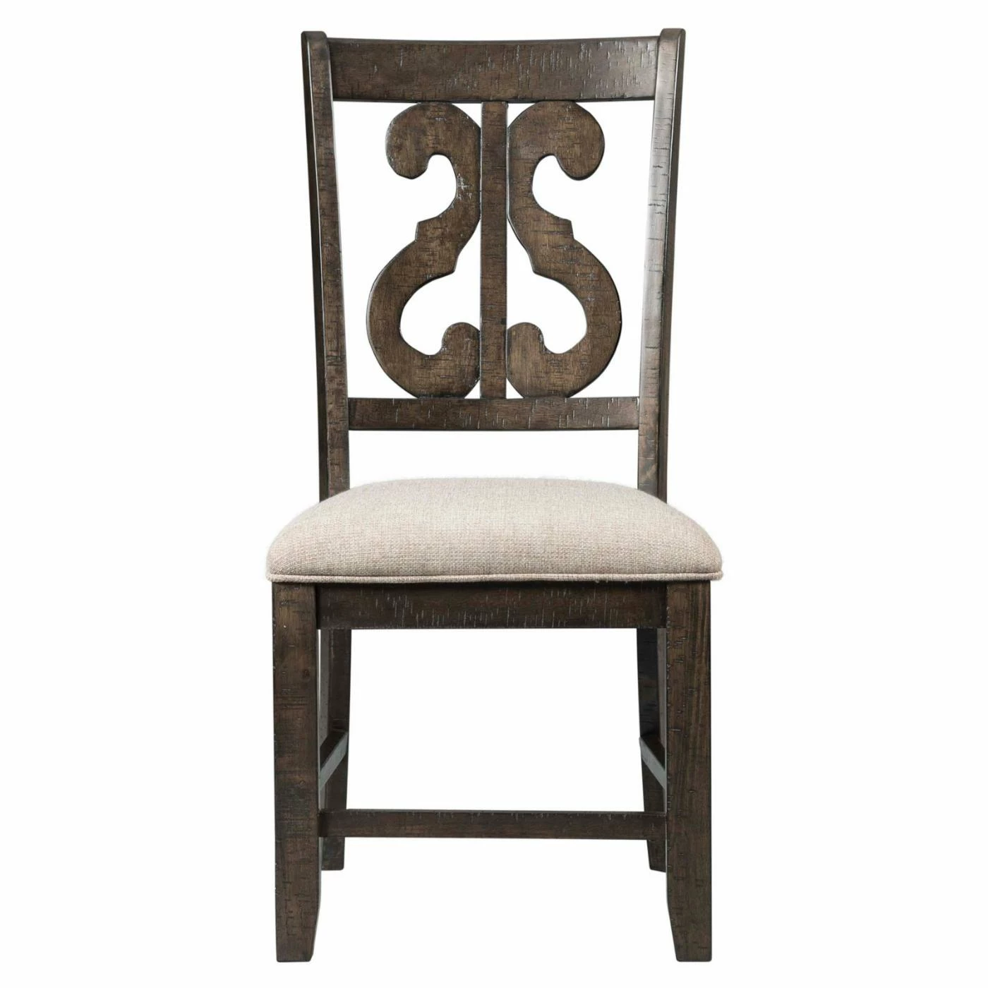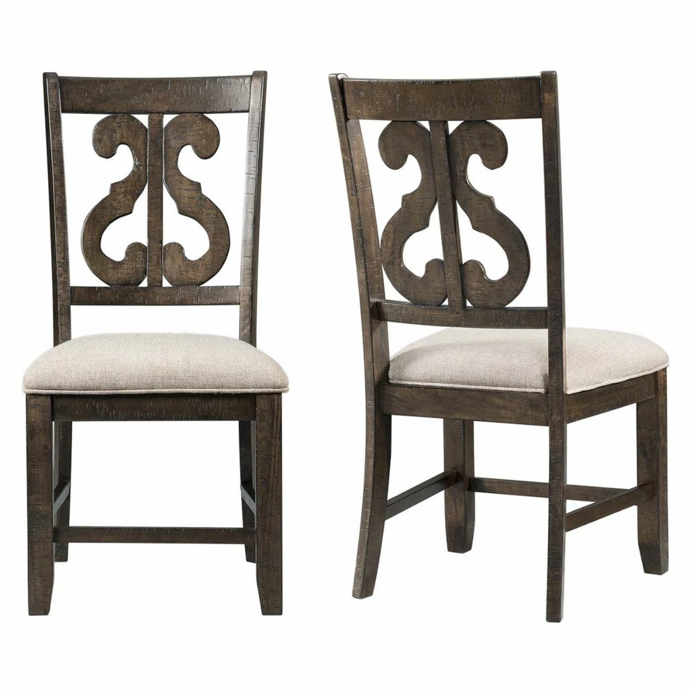 Add elegance to your dining space with the Picket House Furnishings Stanford Dining Side Chair – Set of 2. These matching side dining chairs are made from sturdy wood with a smoky walnut finish. The cushioned seat is upholstered in a dark taupe fabric to easily blend with existing décor. Stretchers along the base provide sturdy support and double as footrests. An intricate, open-swirl back completes the elegant look.