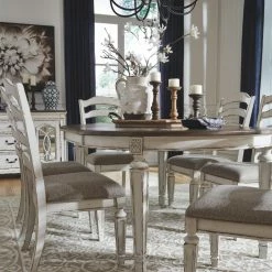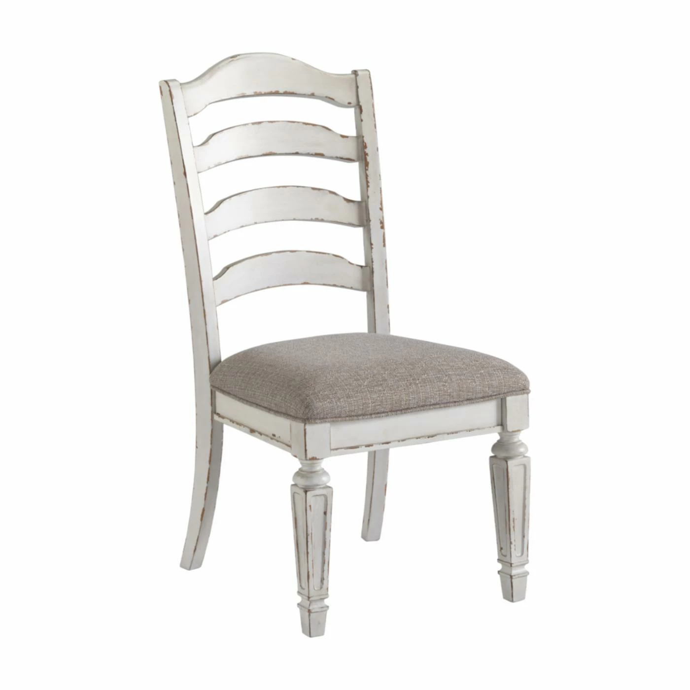 The Signature Design by Ashley Realyn Ladder Back Dining Side Chair – Set of 2 embodies a charming farmhouse-cottage aesthetic. The frames are crafted of hardwood solids along with oak and birch veneers for enduring beauty. The distressed white finish offers a rustic touch. Tapered legs lend support. The foam cushioned seat is upholstered in beige polyester for plush comfort.