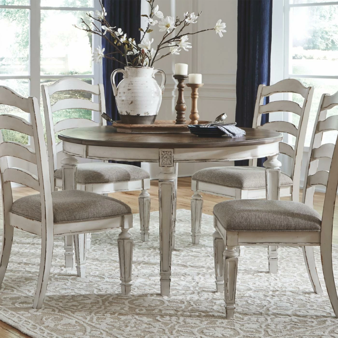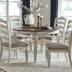 - Distressed white finish and beige upholstery color