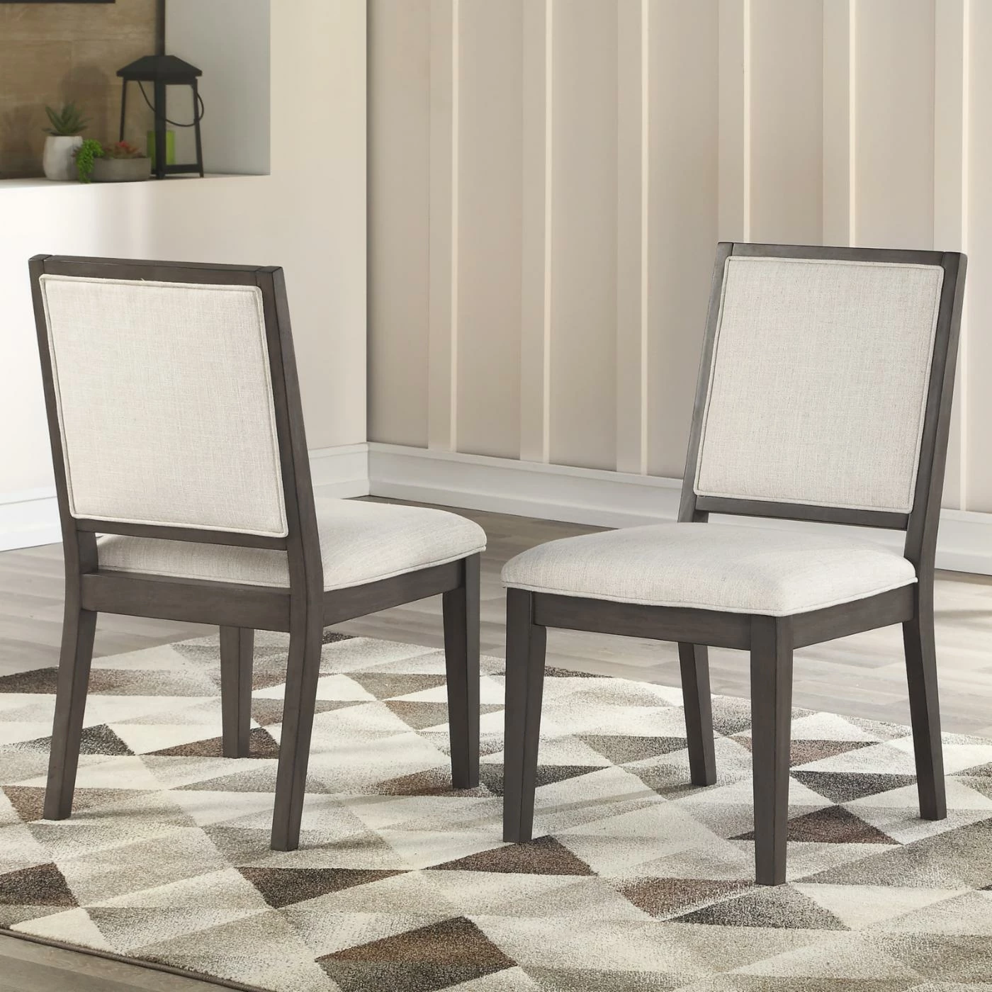 Elevate the style of your dining room with the Steve Silver Co. Mila Dining Side Chair – Set of 2. Each armless dining chair is constructed of solid rubberwood, mango wood, and acacia wood. The chair frame is in a hand-applied, washed gray finish. Each seat and back is upholstered in beige polyester, which nicely complements the gray finish. Protective glides prevent the chairs from damaging your floor. With their neutral finish and contemporary design, these chairs are sure to make an elegant addition to your dining set. Some assembly required.