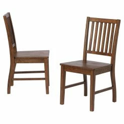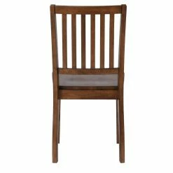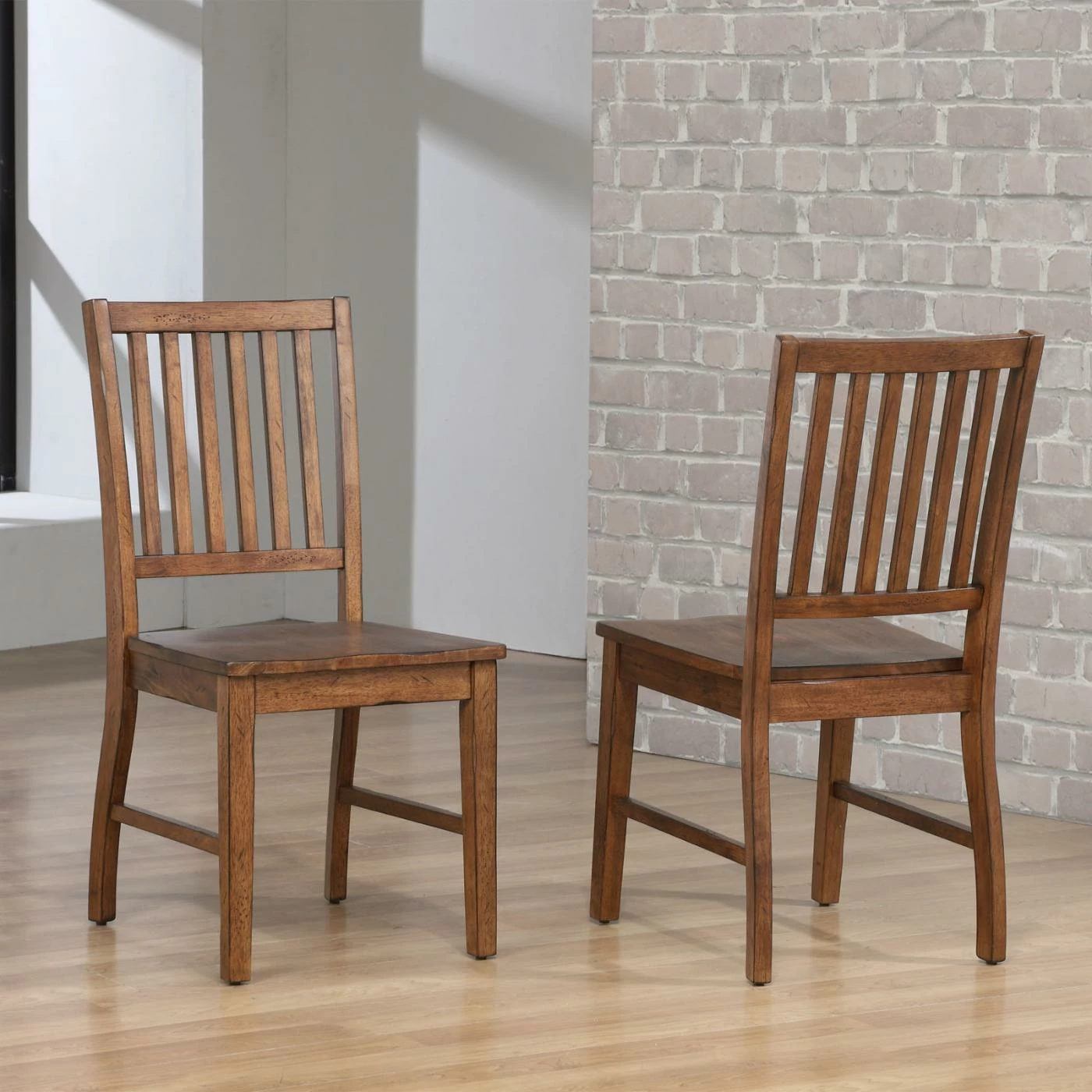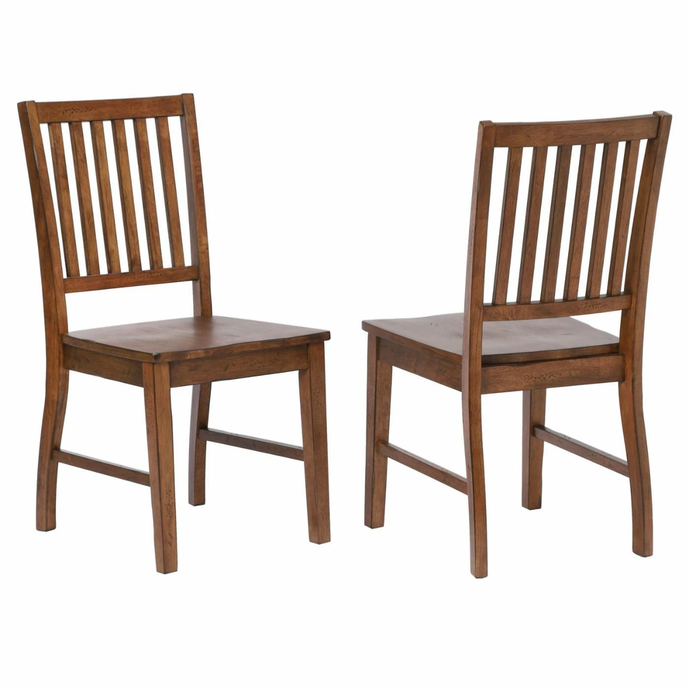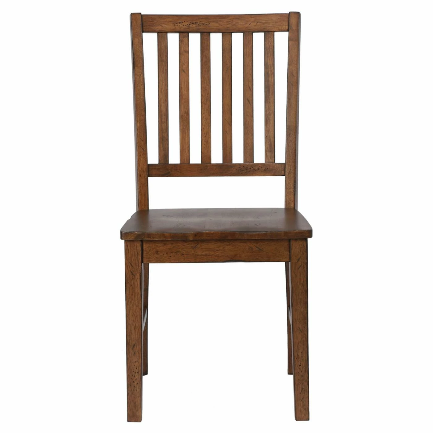 The slat back dining chair is crafted of eco-friendly Malaysian oak with a two-toned finish that enhances its casual appeal. It features distressed wheat on the frame and contrasting rich pecan finish on the seat. This chair has simple lines and a slat back that are reminiscent of craftsman design.