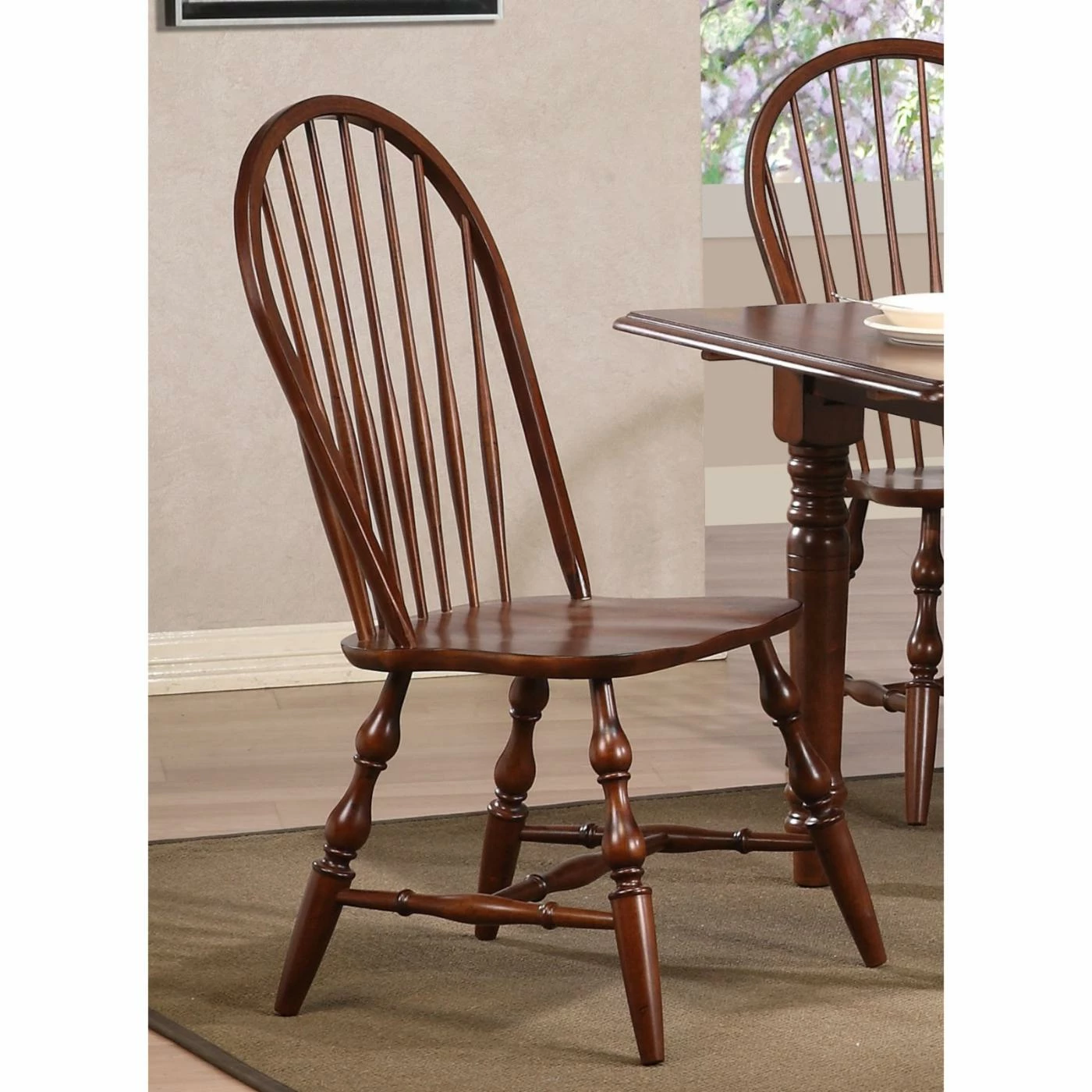 Providing timeless style and comfort, the Sunset Trading Windsor Spindleback Dining Chairs – Set of 2 – Chestnut fits in anywhere. The set includes a pair of Windsor-style spindleback chairs with curved, comfortable backs and scooped seats. The large backrest and seating area provides an ideal seating solution. Plus, perfectly carved, turned legs add to the visual effect. The chairs are made from eco-friendly Asian Ramon hardwood and finished in a rich chestnut brown color. Dimensions: 20W x 19.5D x 38H inches.