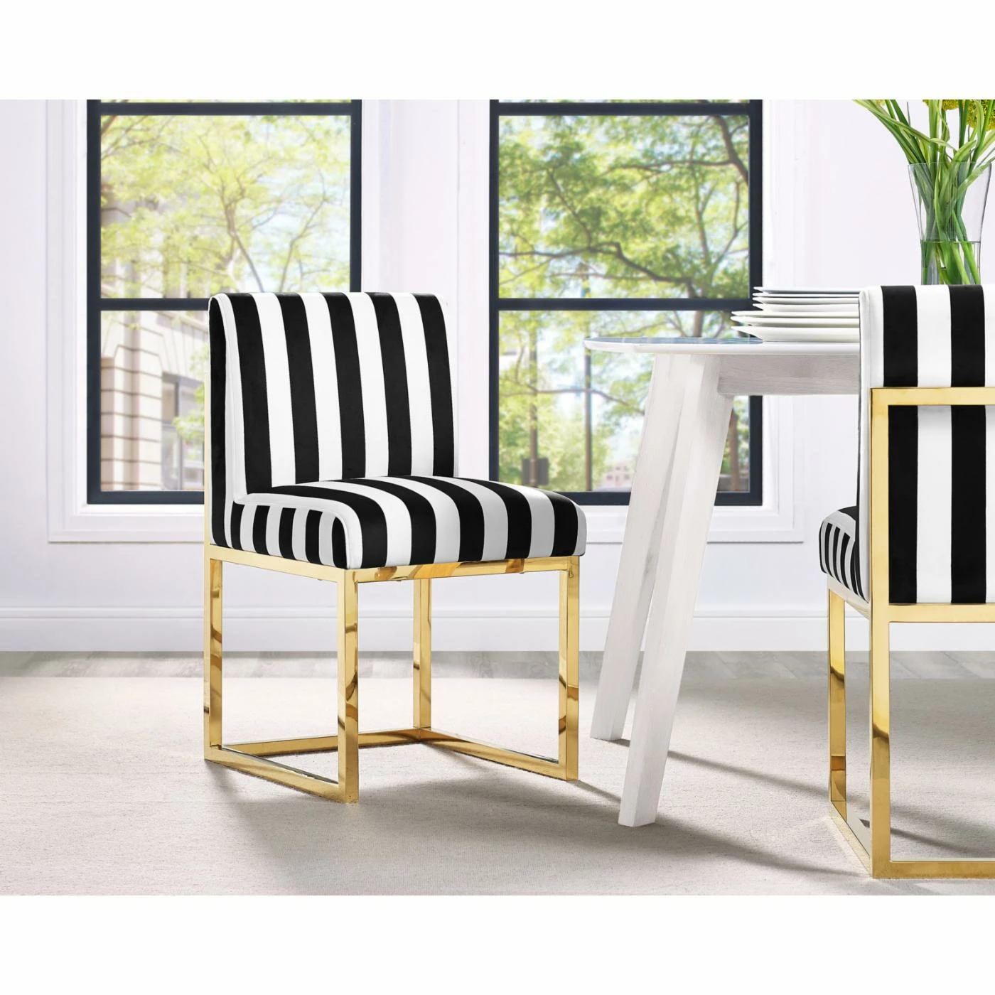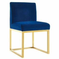 Add glamor to any room in your home with the effortlessly chic TOV Furniture Haute Velvet Dining Chair. This gorgeous chair is constructed with a sturdy frame of stainless steel with a gleaming gold finish that demands attention. It has a cushy padded seat and back, upholstered in sumptuously soft velvet thatβs available in your choice of color. The square base provides a sturdy seat and contemporary style that makes your dining room pop with sophistication.