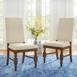 Infuse a little elegance into your rustic dΓ©cor with the Weston Home Patterson Linen Dining Side Chair – Set of 2. The simple, clean lines of this wood dining chair blend well with farmhouse and industrial dΓ©cor, yet the turned legs and nailhead trim add a touch of polish to interiors. Clad in linen and padded with foam, the seat and backrest have an appealing textural effect and provide comfortable support. Coordinating dining furniture is available for purchase separately to complete the look.