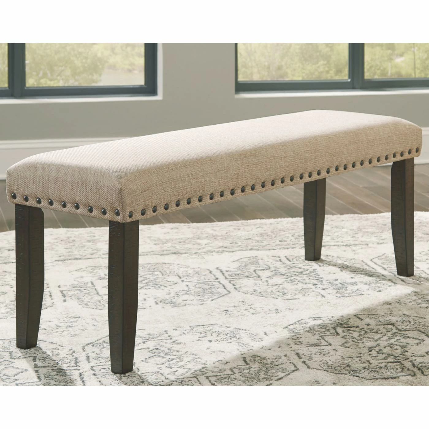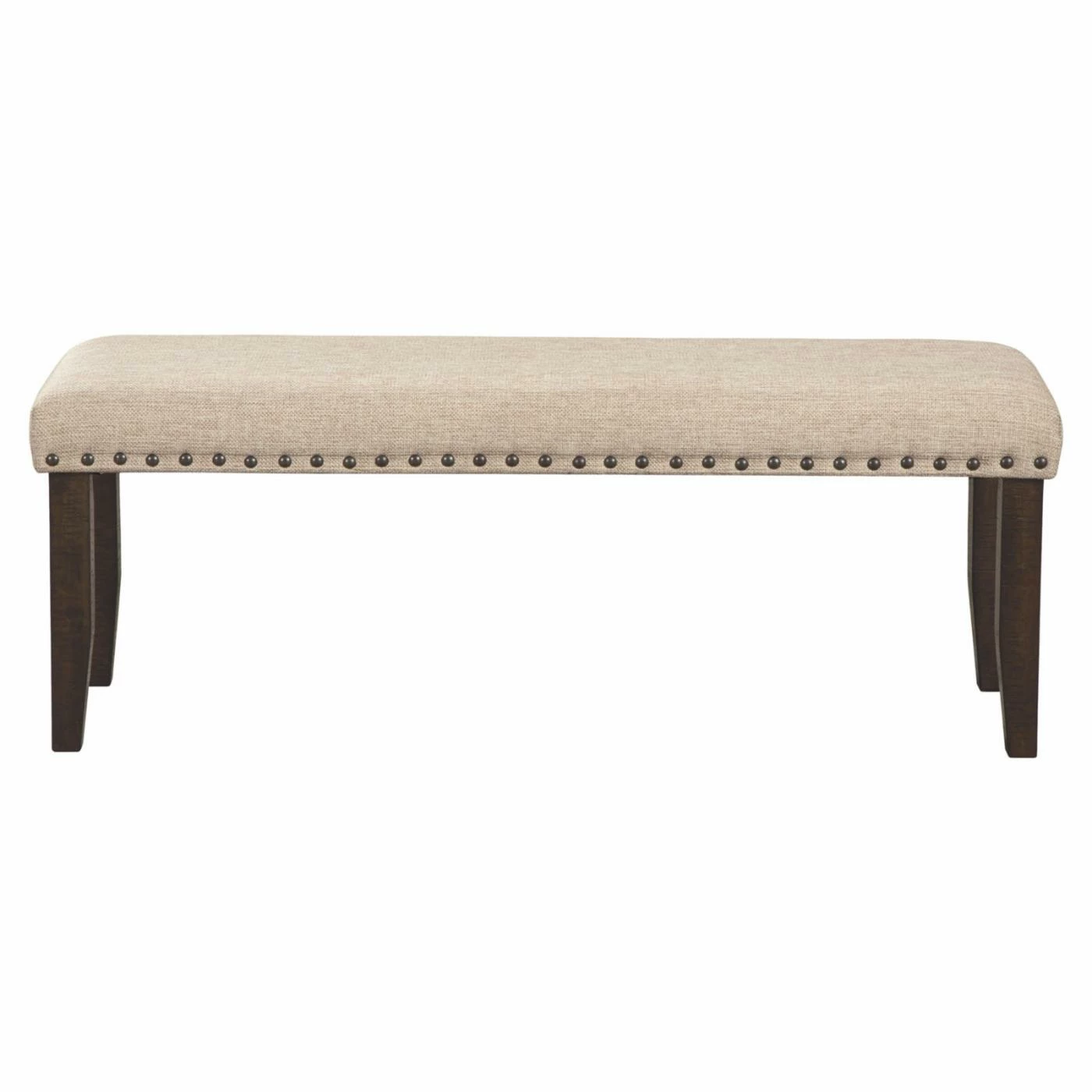 Don’t let elaborate dining chairs take attention away from your table. The Signature Design by Ashley Rokane Backless Upholstered Nailhead Trim Dining Bench provides a backless seating option for two that complements your cottage-style dΓ©cor without overwhelming the eye. Its frame is built from hardy wood with tapered block legs and a dark brown finish. Layers of soft, high-density foam pads the seat, upholstered in a twill-like polyester fabric with a light beige tone. Antique nailheads trim the edges of the bench.